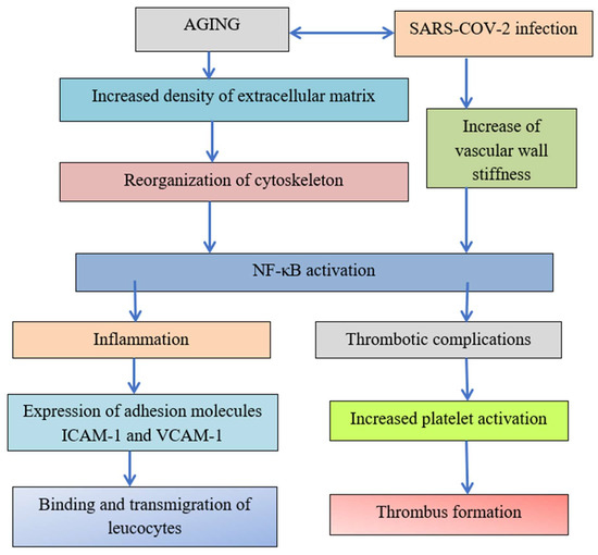 The reorganization of the cytoskeleton induced by increased aging and increased density of ECM due to crosslinking, dehydration, and glycation reactions leads to the activation of transcription factor NF-κB. Both inflammation and thrombotic complications depend on the activation of transcription factor NF-κB. The expression of adhesion molecules leads to the binding and transmigration of leukocytes, but virus entry increases vascular wall stiffness and initiates in critical points with high stiffness platelet adhesion and thrombus formation [3].