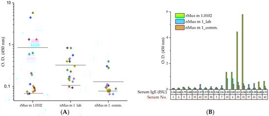 Six out of 18 allergic sera—characterized by the highest measured Mus m 1-specific sIgE levels—reacted to rMus m 1.0102, producing significantly higher responses compared to the nMus m 1 samples (Figure 3B, serum No. 4, 10, 32, 34, 39 and 40). These results suggest that, as demonstrated for routine diagnostics [,], the use of a non-glycosylated recombinant Mus m 1 allergen might improve diagnostic sensitivity, without introducing reactivity to the cross-reactive CCD moiety.