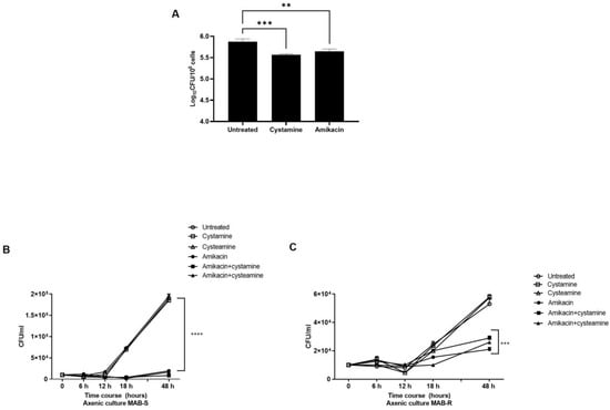M. abscessus infection assay in human cells. Before infection, THP-1 cells (5 × 105/well) were cultured on plates (Thermo Scientific™ Nunc, USA) with 20 nM PMA (Sigma-Aldrich, St. Louis, MO, USA) for 48 h to induce their differentiation into macrophages, then washed three times with PBS, and maintained in 5% FBS [17]. At first, we evaluated the intracellular growth of the original M. abscessus and both variants in human macrophages by infecting cells at an MOI of 1:10 for 2 h. However, we observed important differences in the mycobacterial uptake for the S and R variants (up to a one log10 difference for the R variant) that prompted us to use different MOIs for the two variants [6]. The macrophages were infected with the S variant at MOI (bacteria per macrophage) 1:1, while a MOI 1:10 was used for the R variant [56]. Two hours post-infection (p.i.), cells were washed twice with sterile phosphate-buffered saline (PBS) to remove extracellular bacteria, lysed in 0.01% Triton-X100 (Sigma-Aldrich, St. Louis, MO, USA) and intracellular bacterial loads determined by CFU counting [17]. Treatment of infected cells was started at 4 h p.i. by adding cysteamine (800 µM), cystamine (400 µM), or amikacin (4 μg/mL, Sigma-Aldrich, St. Louis, MO, USA) alone or in combination as indicated [16,17].