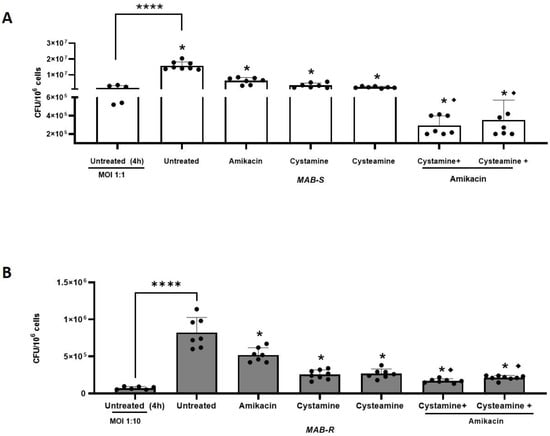 Enhanced effect of cysteamine/cystamine with amikacin. In (A,B), the THP-1 were infected with the R and S variants, respectively (the treatments and combinations with amikacin were added as described above). Two days after infection, cells were lysed to assess intracellular CFUs and the results are shown as Log CFU/106 cells. Box plots chart represented the mean and SD of three independent experiments. Data were analyzed by one-way ANOVA followed by the Tukey comparison test. * represents statistically significant difference of all treatments compared with untreated condition (**** p < 0.001); ♦ represents statistically significant difference of cysteamine and cystamine in combination with amikacin compared with amikacin alone (**** p < 0.001 for both variants).