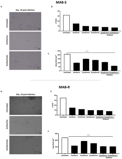 Evaluation of the anti-TG2 treatment in the GLS model of M. abscessus infection. PBMCs obtained from healthy donors were infected with the MAB-S and -R variants, respectively, and left to mature into GLSs for up to 10–12 days. GLSs were treated with different drugs starting at 3 days post-infection: cystamine (400 µM), cysteamine (800 µM), and amikacin (4 µg/mL). Representative light microscopy images of GLSs 10 days post-infection (magnification 20X) infected with MAB-S (A) and MAB-R (D). At this time point, assessing 12 fields/sample, we measured the number of the GLSs infected with MAB-S (B) and MAB-R (E) and the average surface of GLS in 12 fields (MAB-S (C) and MAB-R (F). The means ± standard deviations of scores representative of three experiments each are given the images; **** p < 0.0001 by one-way ANOVA with Dunnett’s multiple-comparisons test compared with untreated condition.