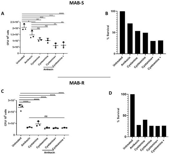 Enhanced effect of cysteamine and cystamine with aminoglycosides in GLS model. GLSs obtained from healthy donors were infected with MAB-S and -R variants at MOI 1:1 and 10:1, respectively, and then treated with different drugs starting at 3 days post-infection treatment of cysteamine and cystamine with amikacin (Sigma-Aldrich) (4 μg/mL). Total CFUs were determined at 12 days post-infection (A,C); * p < 0.05, ** p < 0.01, *** p < 0.005, **** p < 0.001 by one-way ANOVA and Tukey’s multiple comparisons test. Mycobacterial inhibition by the proposed treatments was expressed as a % of survival compared to the untreated group (B,D).