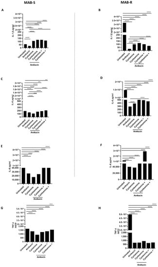 Infection of PBMCs with the MAB-R variant triggers a powerful inflammatory response that is quenched following treatment with cysteamine and cystamine. Infecting PBMCs with M. abscessus to generate the GLS model offers the opportunity to have multiple types of cells that, in part, recapitulate the complex interplay between mycobacteria and peripheral host cells [31]. In addition to monitoring for the number of GLS per well and their size, the experimental model allows the assessment of the secretion of chemokines and cytokines in the supernatant, providing relevant information on the capacity of different treatments to modulate host immune responses. As shown in Figure 5, we measured the concentrations of selected cytokines and chemokines released in the supernatant following infection and treatment in the GLS model. Infection with the MAB-R variant triggered higher levels of IL-1β (32,132 ± 0.80 pg/mL), IL-6 (14,862 ± 0.61 pg/mL), TNF-α (49,896 ± 1.89 pg/mL) and, though to a lesser extent, IL-8 (115.314 ± 2.68 pg/mL) compared with infection with the MAB-S variant (IL-1β 57. 5 pg/mL ± 0.2, IL-6 188 pg/mL ± 0.6; TNF- α 1658 pg/mL ± 0.93, IL-8 63,680 pg/mL ± 1), in line with previous findings [32]. Treatment with amikacin, cysteamine, and cystamine, or their combination with amikacin did not dramatically affect the concentration of IL-6, TNF-α, and IL-8 in PBMCs infected with the MAB-S variant. Conversely, a dramatic reduction in the concentrations of the pro-inflammatory cytokines was observed when the MAB-R variant was treated with amikacin or the TG2 inhibitors (Figure 5A–D), with the only exception being the enhanced secretion of IL-8 (Figure 5E,F) in PBMCs infected with the MAB-R strain and treated with cystamine. Levels of IFN-I were overall low following infections of PBMCs with the MAB-R and -S variants, and treatment with amikacin, cysteamine, and cystamine or their combination did not significantly modulate the concentration of type I IFN (Supplementary Figure S3). Conversely, infection with MAB-R triggered secretion of IL-1β (≈30.000 pg/mL) that was dramatically reduced following treatment with amikacin (≈30 pg/mL). Treatment with cysteamine or cystamine of PBMCs infected with MAB-R led to levels of IL-1β slightly higher than those observed in the amikacin-treated group. Interestingly, infection of PBMCs with MAB-S did not lead to high levels of IL-1β, although treatment of these infected cells with cysteamine and cystamine warranted a higher level of IL-1β in the supernatant compared to the untreated and amikacin-treated groups.