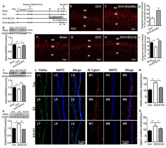 The hippocampus is a primary target of estrogens and plays a key role in learning and memory, and stress responses [1]. 17β-Estradiol (E2), a major form of estrogen, plays an important role in spine formation, synaptic plasticity, and learning and memory [1,2,3]. However, the underlying mechanism is largely unknown. Our RNA-seq study showed that Klotho (KL) mRNA levels in the hippocampus are positively correlated with the levels of circulating E2 during the estrous cycle and that the OVX-mediated decrease in hippocampal KL mRNA levels is reversed by E2 replacement [4]. These results spurred an interest in further studying the regulation of KL by estrogen and the function of KL protein in the rat hippocampus.