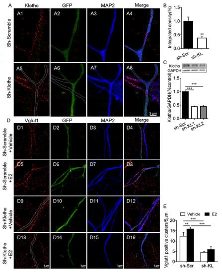 2.2. E2 Did Not Affect the Number of Vglut1-Positive Excitatory Presynaptic Terminal When the Endogenous KL Level Was Reduced in Hippocampal Neurons