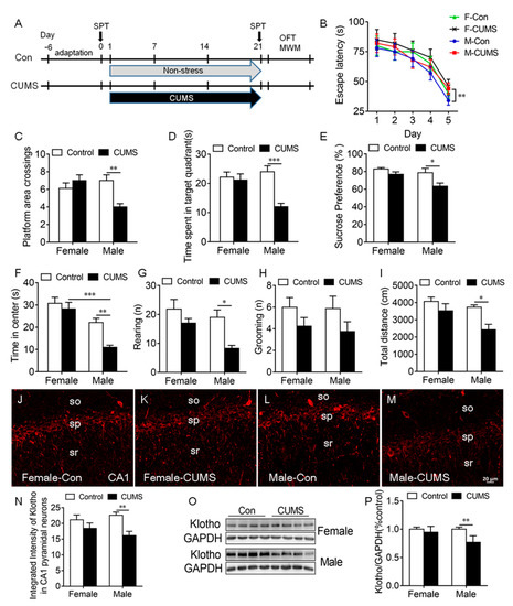 CUMS-induced spatial learning and memory impairment, anhedonic-like behaviors, and anxiety-like behaviors in male rats were accompanied by a decrease in KL protein levels in the hippocampus of male but not female rats. Experimental design. Sucrose preference test (SPT), open-field test (OFT), and Morris water maze (MWM) test (A). Latency to the platform in rats of both sexes during 5-day training in the MWM test. CUMS decreased the latency on day 5 during training in male but not female rats (B). CUMS decreased the number of platform crossings (C) and the time spent in the target quadrant (D) in males only on day 6 during the probe trial. Only male rats showed a decrease in sucrose consumption in the SPT after CUMS (E). Time spent in the center of the open field (F), the number of rearing times (G), the number of grooming times (H), and the total distance traveled (I) in the OFT. Representative confocal images of KL staining (red) in the hippocampal CA1 area in female control (J), female CUMS (K), male control (L), and male CUMS (M) rats. Quantification of fluorescence intensity of KL staining in the hippocampal CA1 area in male and female rats (N). Western blot analysis of KL protein (130 kDa) in the hippocampus of male and female rats (O,P). Data are shown as the mean ± SEM. Two-way ANOVA followed by Tukey’s test. * p < 0.05, ** p < 0.01, *** p <0.001, n = 8–10.