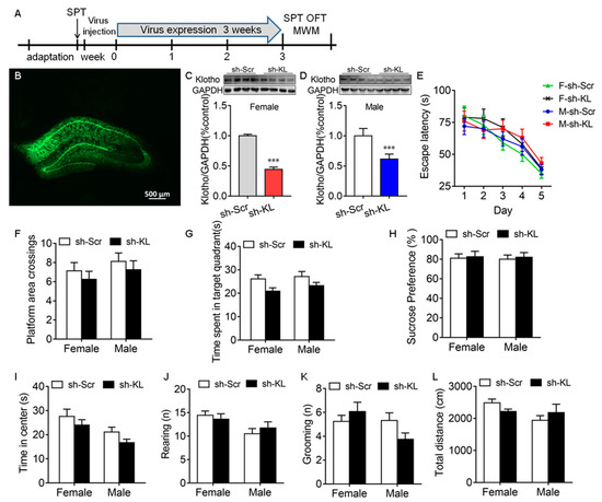 AAV-mediated decrease in the expression of hippocampal klotho (KL) protein did not impair spatial learning and memory in the Morris water maze test and induce anhedonic-like behaviors. Experimental design. Sucrose preference test (SPT), open-field test (OFT), and Morris water maze (MWM) test (A). Representative image of AAV-KLshRNA-GFP expression (B). Western blot analysis showed a decrease in the levels of hippocampal KL protein (130 kDa) due to Klotho shRNA (sh-KL) compared to scrambled shRNA (sh-Scr) in female (C) and male (D) rats. In the MWM test, the decreased expression of KL did not alter the latency to the platform on days 1–5 during training in the MWM (E), the number of platform area crossings (F), and the time spent in the target quadrant on day 6 (G) during the probe trial in male and female rats. No significant difference between the sh-KL and sh-Scr groups in sucrose consumption was found in the SPT (H). Time spent in the center of the open field (I), the number of rearing times (J), the number of grooming times (K), and the total distance traveled (L) in the OFT. (C,D) t-test; (E) two-way repeated-measures ANOVA; (F–L) two-way ANOVA followed by Tukey’s test. Data are shown as the mean ± SEM. *** p < 0.001, n = 8–13.