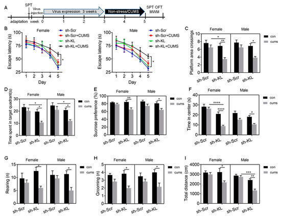 AAV-mediated decrease in KL protein levels increased stress susceptibility and diminished sex differences in spatial learning and memory deficit, anhedonic-like behaviors, and anxiety-like behaviors induced by 2-week CUMS. Experimental design. Sucrose preference test (SPT), open-field test (OFT), and Morris water maze (MWM) test (A). In the MWM test, CUMS did not alter the latency to the platform in KL normal rats of both sexes during 5-day training but CUMS caused a decrease in the latency to the platform in KL-KD (knockdown) rats of both sexes on day 5 during training (B). CUMS did not alter the number of platform area crossings (C) and the time spent in the target quadrant (D) in KL normal rats of both sexes. In contrast, in KL-KD rats of both sexes, CUMS decreased the number of platform area crossings (C) and the time spent in the target quadrant (D) in the MWM test. CUMS caused a decrease in sucrose consumption in the SPT (E), a decrease in the time spent in the center of the open field (F), a decrease in rearing times (G), a decrease in grooming times (H), and the total distance traveled (I) in the OFT in KL-KD rats of both sexes. Data are shown as the mean ± SEM. (B) Three-way repeated-measures ANOVA; (C–I) three-way ANOVA followed by Tukey’s test. * p < 0.05, ** p < 0.01, *** p < 0.001, **** p < 0.0001, n = 6–8. sh-KL, KL-shRNA; sh-Scr, control scrambled shRNA.