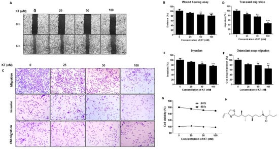 Wound healing, transwell migration, and invasion assays were performed to determine KT’s effect on cell migration. A wound healing assay was carried out within 16 h after KT treatment, whereas migration and invasion assays were carried out after 24 h of KT treatment. As a result, wound healing ability was significantly decreased in KT of 25, 50, and 100 nM compared with control (Figure 1A,B). The transwell migration assay shows that the respective concentration of KT suppresses the migration of cancer cells. The 50 and 100 nM concentrations of KT inhibit cancer cell invasion (Figure 1C–E). Our results indicate that KT reduces the motility of MDA-MB-231 breast cancer cells.