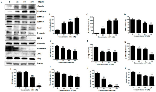 KT suppresses breast cancer epithelial-mesenchymal markers. Cells were cultured with DMEM high glucose (growth media) with or without 25, 50, and 100 nM concentrations of KT. (A) Western blot analysis was performed to determine the expression of breast cancer EMT marker proteins. (B–K) Quantitative analysis of the expression of EMT marker proteins. Results are presented as means ± S.D. (n = 3). * p < 0.05, ** p < 0.01, and *** p < 0.001 indicate significant differences between KT-treated groups and control.