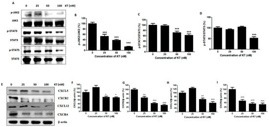 JAK2/STAT3 is responsible for breast cancer progression. JAK-2, STAT3, and STAT5 regulate genes that promote breast cancer cell survival, proliferation, and metastasis [8]. As shown in Figure 3A–D, protein expression of p-JAK2, p-STAT3, and p-STAT5 were markedly reduced by KT treatment. This result indicates that KT suppressed the JAK2/STAT3 pathway and prevented breast cancer cell survival and metastasis.