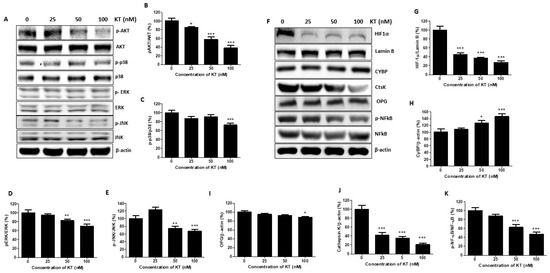 Cathepsin K, OPG, and NF-kB play a crucial role in osteolysis and cancer cell migration. Calcyclin-binding protein (CYBP) has been reported as a migration suppressor [25], and cathepsin K is well known as a positive regulator of bone resorption, cancer progress, and cancer cell migration. The expression of CYBP was increased by around two times compared to the control, whereas that of cathepsin K was decreased dose-independently after treatment with KT. OPG produced by the bone reduces bone degradation. However, OPG produced by cancer cells increases bone resorption. Besides the role of NF-kB in osteolysis, it also plays a role in promoting tumor cell proliferation and survival. KT inhibits the expression of both OPG and NF-kB (Figure 4A–F).