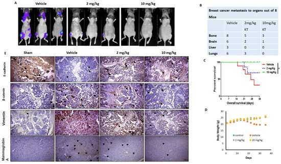 KT inhibits distant breast cancer metastasis in vivo. (A) MDA-MB-231 cells were intracardially injected into the mice. After five weeks with or without treatment of KT, each group of mice had bioluminescence after five weeks. (B) Several distant metastases in mice of each group. (C) The Mantel-Cox log-rank test was used to determine percentage survival. (D) Average mouse weights during the course of the study were measured. (E) Femurs were fixed, decalcified, embedded, sectioned, and subjected to immunohistochemistry for EMT marker proteins such as E-cadherin, β-catenin, and vimentin in the femur section (Scale bar, 100 µm). Arrow indicates the dense staining of the biomarker. Immunohistochemistry for mammaglobin A protein in the brain section was performed. Results are presented as means ± S.D. (n = 8). * p < 0.05 indicates significant differences between KT-treated groups and vehicle.