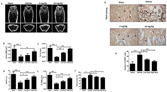 Both femurs of mice were analyzed using a high-performance in vivo micro-CT Skyscan 1076 (Skyscan, Kontich, Belgium), with an image field at a pixel size of 13 µM. The distal femoral metaphysis was analyzed from a region that was 1.0 mM below the growth plate and 1.5 mM in length. For quantitative analysis, the software CTAn (Skyscan) was used to obtain the following parameters within the region of interest (ROI): bone volume/tissue volume (BV/TV), trabecular thickness (Tb. Th), trabecular separation (Tb. Sp), trabecular number (Tb. N), and trabecular bone mineral density (BMD) [49]. The cortical BMD was analyzed in the middle of the diaphysis of the femur.