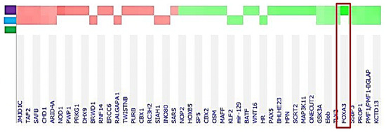 Foxa3 is significantly decreased in rat testes exposed in utero to Gen + DEHP mixtures, but not by Gen or DEHP alone. Ingenuity pathway analysis (IPA) of the microarray data searching the term “transcription” identified Foxa3 (red box) as downregulated in testes from adult rats exposed in utero to 10 mg/kg/day Gen + DEHP (p-value ≤ 0.05). Treatments: Gen, green; DEHP, blue; Gen-DEHP, purple. Expression changes: Red, upregulation and green, downregulation.