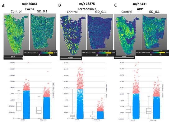 MALDI imaging mass spectrometry reveals that FOXA3 protein is decreased in adult testes after in utero exposure to Gen + DEHP mixture. Proteins were identified according to their mass in frozen sections of PND120 rat testes treated with vehicle (control) and Gen + DEHP mixture (GD) at 0.1 mg/kg/day, analyzed by MALDI IMS: (A) Foxa3; (B) Ferredoxin 2; (C) Androgen-binding protein (ABP). For each protein, the left panel shows the intensity of protein signal, with yellow representing the highest intensity; while the Box plots in the right panel show the quantification of relative signal intensity in testis sections, normalized by surface unit.