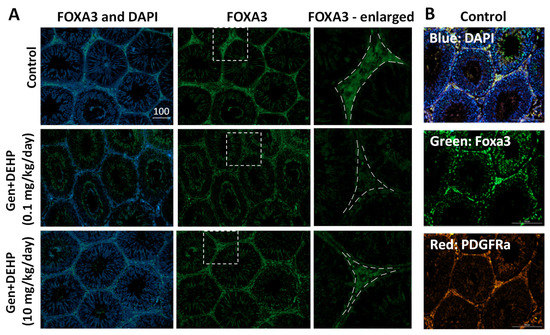 FOXA3 protein expression is decreased in testicular interstitial cells from adult rats exposed in utero to Gen + DEHP mixtures: (A) FOXA3 IF signal in testes from control rats and from rats exposed to Gen + DEHP mixture at 0.1 or 10 mg/kg/day. Left panel, merged IF images of FOXA3 (green) and DAPI nuclear staining (blue); middle column, FOXA3 IF alone; right column, magnification of white dotted inserts indicated in middle column; (B) IF colocalization of FOXA3 (green) and PDGFRa (red) in control rat testes. Representative photos are shown. Same scale in µm used for left and center columns in panel A, and in all pictures of panel B.