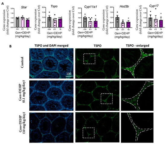 Fetal exposures to Gen + DEHP mixtures affect adult steroidogenesis-related genes: (A) qPCR analysis of steroidogenic genes in control (Crtl), Gen + DEHP mixtures at 0.1 and 10 mg/kg/day, excluding infertile rats. N = 3–5 per treatment; (B) protein expression of TSPO identified by immunofluorescence (green) showing reduced protein expression in testes from rats exposed in utero to 0.1 and 10 mg/kg/day of Gen + DEHP mixtures as compared with control rats. Representative photos are shown. Same scale in µm used for left and center columns in Figure 5B. Pictures in the right column are enlarged views of the white dotted area in pictures from center column.