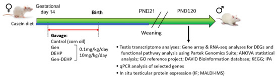 Animal treatments and tissue collection were performed as previously described [26]. Timed pregnant Sprague-Dawley rats were purchased from Charles Rivers Laboratories (Saint-Constant, QC, Canada) and switched to a casein/cornstarch-based, phytoestrogen-free diet (casein diet) AIN-93G (Teklad diet, Envigo, Indianapolis, IN, USA) from 2 days before gavage to weaning, to avoid dietary exposure to genistein. The rats were maintained on a 12L:12D photoperiod with ad libitum access to food and water and handled according to protocols approved by the McGill University Health Centre Animal Care Committee and the Canadian Council on Animal Care. Pregnant rats were treated by gavage from gestational day 14 to parturition with either vehicle (corn oil) alone or containing GEN, DEHP, or GEN + DEHP mixtures at the doses of 0.1 and 10 mg/kg/day, encompassing exposure levels found in the general population to those measured in vegetarian/vegan women and more susceptible populations such as hospitalized neonates exposed to DEHP via medical equipment and fed soy formula (Figure 6) [16,51,52,53,54,55]. Doses were adjusted to changes in dam weights. Offspring were weighed and euthanized at PND120. The testes were collected, weighed, and either fixed in 4% paraformaldehyde or snap frozen for gene and protein expression analyses.
