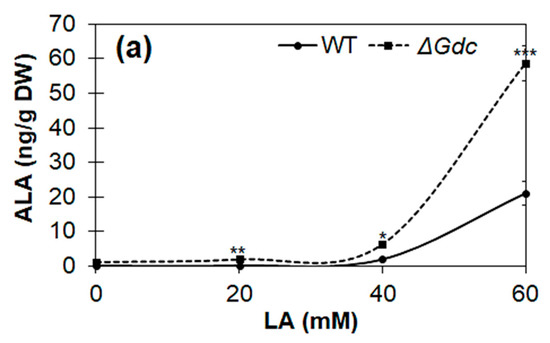 The above analysis suggested that the upregulation of hemB might have increased Pbs activity, consequently limiting ALA accumulation. We subsequently investigated the effect of various LA concentrations on the expression levels of pathway genes in Synechocystis WT and ΔGdc strains. As expected, a significant increase in the transcription of ALA biosynthesis genes, especially of hemA and hemL, was observed in Synechocystis, with the highest mRNA levels observed in ΔGdc cells in the presence of 60 mM LA (as shown in Figure 5b). Moreover, the transcript levels of gdhA were also markedly increased in Synechocystis in the presence of 60 mM LA, whereas the Gdc transcripts were not considerably upregulated in WT cells exposed to 60 mM LA, thereby suggesting that the LA inhibition of Pbs results in an upregulation of the GdhA and the ALA synthesis route to benefit the ALA accumulation. However, the mRNA levels of hemB (whose product is inhibited by LA) were increased in LA-treated cells, indicating the inadequate feedback-inhibition occurring from the downstream metabolic products. This inadequacy is due to an interruption in the ALA catabolism that results in an upregulation of hemB, but not of the activity of Pbs, as LA blocks the latter. This biochemical change might also be responsible for the increased hemA and hemL transcription, whose products are directly involved in the catalysis of the ALA biosynthesis. The effect of LA on the cellular ALA levels of Synechocystis was assessed to validate these results further.
