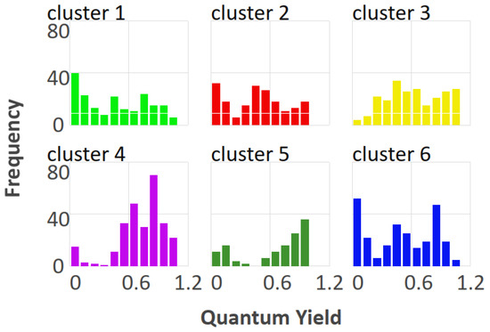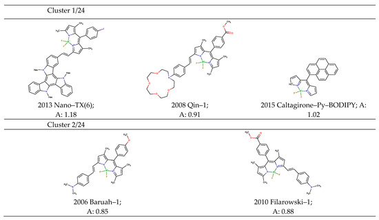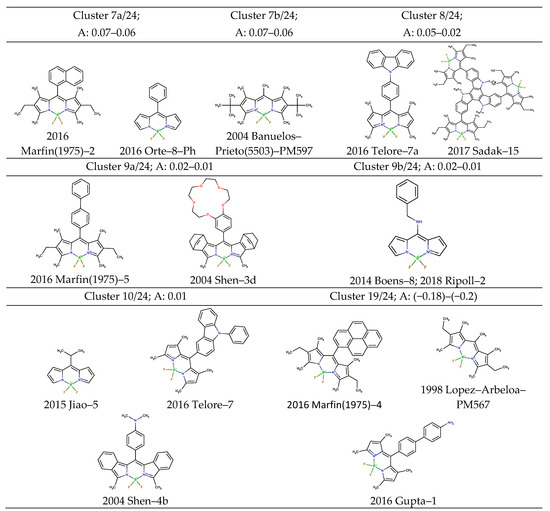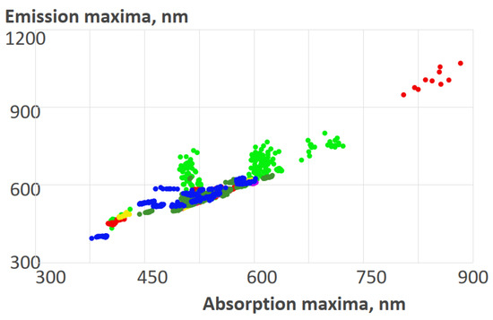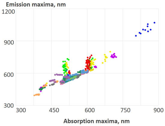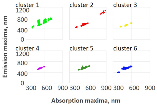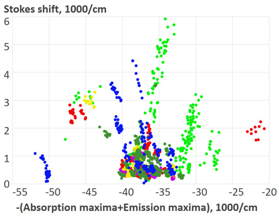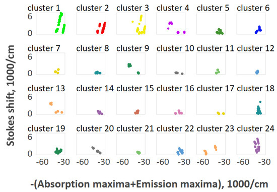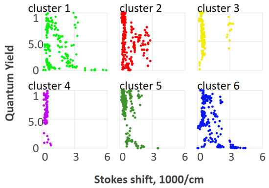 The above-mentioned members of clusters 7, 8, 9, 10, and 19 formed groups of dyes with quantum yields within 0.02–1 and Stokes shifts within 170–860 cm−1, 1270–1400 cm−1, and 2190–2800 cm−1.