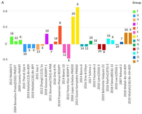 The analysis of the solvatochromic sensitivity parameter A for all duplicates is a compact form of comparison of the data for solvatochromic behaviour compared with the whole spectral dataset. The solvatochromic sensitivity of the compounds of the groups G, M, N, O, P, Q, and R lies within the limits of the experimental error shown in the dataset represented in files of SI.csv and SI.sdf. However, several other compounds depict a high deviation, for example, a parent compound 2009 Arroyo-1 in group A, 2015 Waddell-1, 2015 Waddell-2, and the compounds in groups I and J.