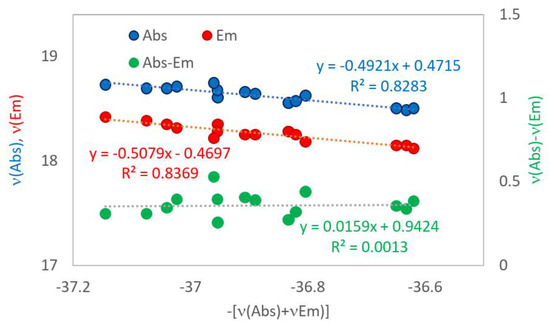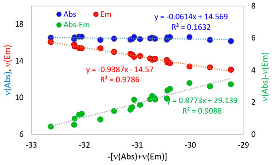 An illustration of the calculation method is provided in the papers [56,57]. Some additional examples are given below in Figure 13, Figure 14 and Figure 15 for the fluorophores discussed above. In the case of high positive and negative solvatochromism (Figure 13 and Figure 14), the Stokes shift exhibits a low statistical deviation from the linear correlation suitable for the estimation of parameter A; in the case of near-zero solvatochromism (Figure 15), the absorption or emission wavenumbers are more suitable for this purpose.
