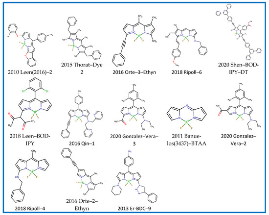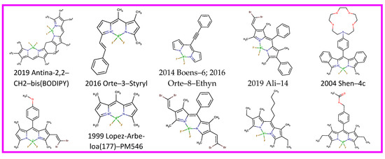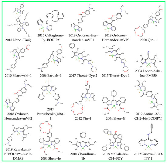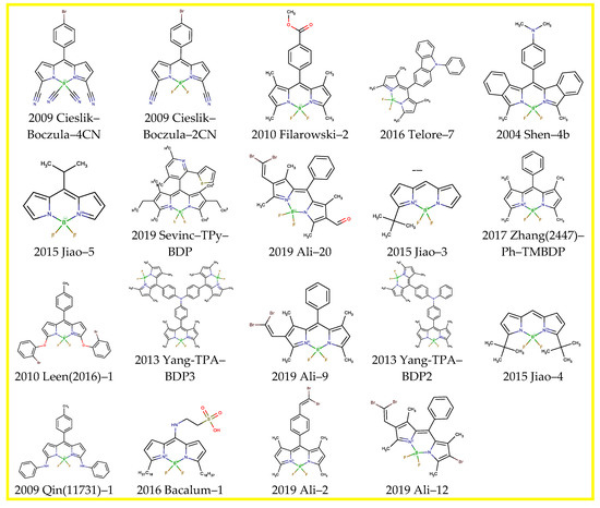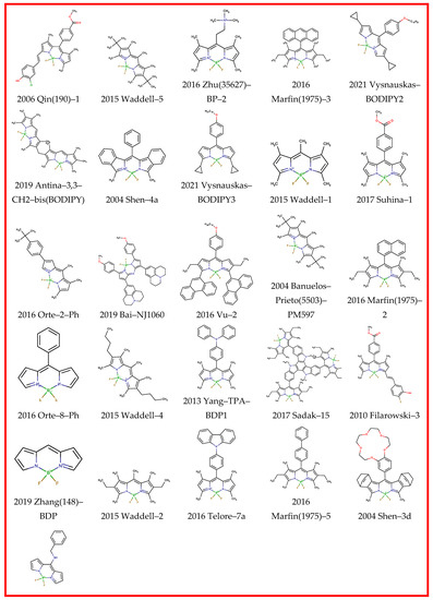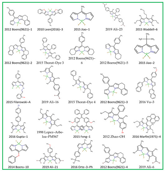 The list of dyes included a total dataset of 115 BODIPYs and the corresponding references are shown above in Table 1 (Section 2.1). The dataset of BODIPY fluorophores collected in this study are listed in SI.csv and SI.sdf files with a correspondent count for solvents; references and IDs generated from the year of publication, first author, and title of the compound in the paper. The chemical structure in SMILES format and the direct code of JChem [107] was used for arranging the data. Each series of spectral and photophysical data are represented by 10–30 solvents for the analysis of the solvatochromic effect.