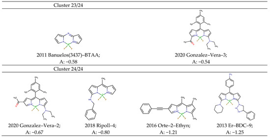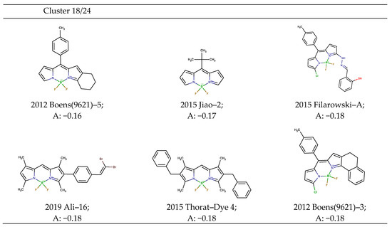 It is noteworthy that the diagram for quantum yield versus Stokes shift in Figure 10 for several dyes in clusters 1, 2, and 23, 24 could be approximated by one curve, respectively, while the plot for the Stokes shift versus − (absorption maxima + emission maxima) for the correspondent clusters in Figure 9 could be approximated by two lines. As an exception, a slight increase in the quantum yield versus Stokes shift is exhibited for parent aza-BODIPY, 2011 Banuelos(3437)-BTAA [69], which is provided in the dataset for comparison with the dipyrrin dyes. A similar behavior is demonstrated by 2018 Leen-BODIPY [93] in cluster 22/24, which could be attributed to the keto-enol tautomerism of the diketone fragment of the molecule.