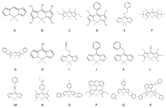 The chemical structures of the BODIPY sensors classified according to the above procedure of clustering are provided in the six chats below (Scheme 1, Scheme 2, Scheme 3, Scheme 4, Scheme 5 and Scheme 6).