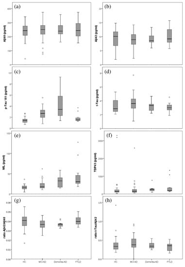 Box plots representing the plasma levels in the different participants groups (healthy controls (HC), MCI-AD, dementia-AD, FTLD). (a) Aβ40; (b) Aβ42; (c) p-Tau181; (d) t-Tau; (e) NfL; (f) TDP-43 (g) ratio Aβ42/Aβ40; (h) ratio t-Tau/Aβ42.