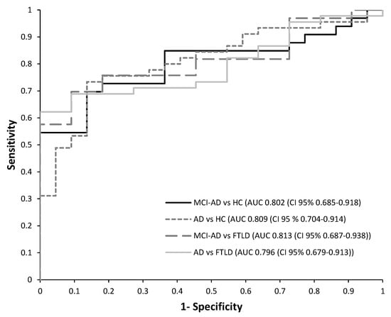 Then, a receiver operating characteristic (ROC) curve analysis was performed to estimate the diagnosis potential of this panel of plasma biomarkers in each developed model. The results obtained for each PLS model are summarized in Table 4. Among them, it is important to highlight the model discriminating AD patients, since the early stages (MCI-AD, mild dementia-AD), from HC subjects, and it showed satisfactory accuracy (AUC 0.809), as well as sensitivity (73.3%), specificity (86.4%), and PPV (91.7%). Similarly, the model discriminating HC vs. MCI-AD showed satisfactory accuracy (AUC 0.802), as well as sensitivity (69.7%) and specificity (86.4%). In addition, the model discriminating MCI-AD patients from FTLD subjects showed high accuracy (AUC 0.813), reflecting its potential capacity in specific AD diagnoses, as well as the model discriminating AD patients (MCI-AD, mild dementia-AD) from FTLD patients (AUC 0.796, sensitivity 62.2%, specificity 100%).