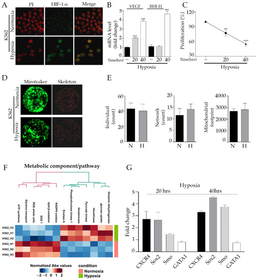 Hypoxia activates a quiescent state in Philadelphia-positive (Ph+) cell line: (A) Immunofluorescence of K562 cells incubated under hypoxic conditions for 20 and 40 h. The green nuclear staining corresponding to HIF-1α, a known marker of hypoxia, was registered after 40 h of low oxygen. Red propidium was used for nuclei staining. (B) Vascular endothelial growth factor (VEGF) and HIF-1 α Subunit (BHLH) gene expression was assayed by quantitative reverse transcription PCR (qRT-PCR) in K562 cells under normoxic and hypoxic conditions. The significant rise observed was indicative of low oxygen tension. (C) K562 cells under hypoxic conditions for 20 and 40 h were subjected to MTT assay to evaluate the proliferation index. The percentage of proliferation is expressed after normalizing with normoxia cells (100%). (D) The original green image obtained with confocal microscope is a Z-stack reconstruction image created (63× magnification) after mitotraker staining. It has been processed by MiNA toolset to draw an accurate skeleton of the mitochondria within the cell. (E) The number of individuals (unbranched structures), the number of networks (mitochondrial branched structures) and the mitochondrial footprint (the area occupied by mitochondrial structures) are unchanged between hypoxia vs. normoxia conditions. (F) Metabolic analysis profile of normoxic and hypoxic conditions. The results of a hierarchical clustering calculation applied on data are displayed in the heat map as a dendrogram. Heatmap represents processes with a significantly reduced activity in blue while processes with a significantly increased activity are in red. K562 H1, 2 and 3 corresponded to hypoxic condition triplicates. K562 N1, 2 and 3 represented the normoxic condition triplicates. (G) mRNA analysis of well-known stem cell markers (CXCR4, SOX2, SMO and GATA-1) in K562 cells under normoxia or hypoxia. Gene expression was represented as fold changes compared to normoxic conditions. ** p ≤ 0.01 and *** p ≤ 0.001.