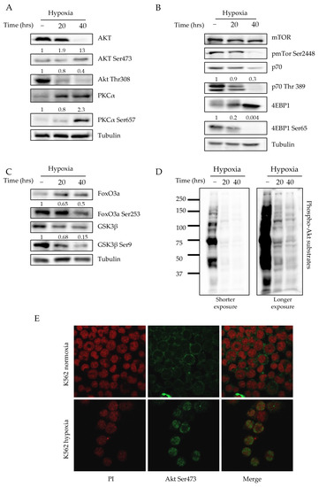 By examining the levels of phosphorylation of Akt substrates in K562 cell lysates under hypoxic conditions by using a phosphor-specific antibody recognizing the degenerated Akt substrate peptide (R-X-R-X-X-S/T where X is any amino acid residue), we observed a sharp reduction in the phosphorylation pattern (Figure 2D) [34]. However, the presence of a few additional bands appearing under hypoxic conditions suggested the occurrence of substrates that were phospho-Akt (Ser473)-specific. Finally, we examined kinase localization under both normoxic and low-oxygen conditions. As shown in Figure 2E, hypoxia triggered the relocalization of Akt within the nuclear compartment. Interestingly, while such behavior was strictly dependent on Ser473 phosphorylation, it was fully independent from the phosphorylated Thr308 (Figure S1C).