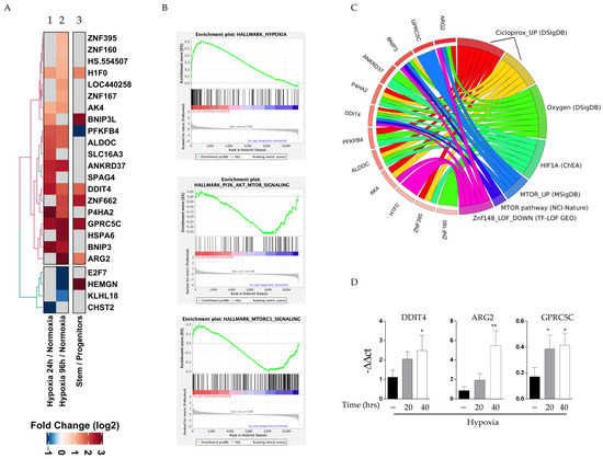 To consolidate our evidence, a Gene Ontology analysis of DEGs resulted in a significant enrichment (False Discovery Rate—FDR—adjusted p-value < 0.05) of different terms related to metabolic alterations and adaptive responses to hypoxia (Figure 3B). Specifically, we found that enrichment in glycolysis (adj. p-value = 1.53 × 10−2) was represented by genes encoding for -Phosphofructo-2-Kinase/Fructose-2,6-Biphosphatase 4 (PFKFB4) and Aldolase Fructose-Bisphosphate C (ALDOC). PFKFB4 and ALDOC genes together with Ankyrin Repeat Domain 37 (ANKRD37), Zinc Finger Protein 395 and 160 (ZNF395 and ZNF160), Prolyl 4-Hydroxylase Subunit Alpha 2 (P4HA2) and the DNA Damage Inducible Transcript 4 (DDIT4) were predicted targets of the transcriptional regulator of the adaptive response to hypoxia (HIF-1 α). Interestingly, the mTOR pathway (adj. p-value = 1.76 × 10−3) appeared among the most relevant pathways under hypoxia. In detail, MTOR_UP, as reported in the circle plot, corresponded to a specific signature obtained in cells after the inactivation of the mTORC1 pathway, a condition that mimics the mTORC1 status observed in our specimens. The genes related to this process that arose after the analysis include DDIT4, ARG2, GPRC5C and BNIP3.