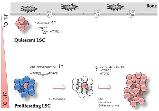 Proposed model of mTORC2 involvement in regulation of quiescent/proliferating LSC. Under low oxygen concentration (1% O2) mTORC2 and Akt (Ser473) could be in an active state (arrows) at the expense of mTORC1. Otherwise, under normal oxygen concentration (21% O2) a balance between mTORC1 and mTORC2, and consequently between Akt (Ser473) and Akt (Thr308) could be detected. The contribute of mTOR complexes on leukemia relapse is unknown (question mark), we proposed the possibility that mTORC2 can have a role in modulate the relapse, in association with other factors, e.g., mutations.