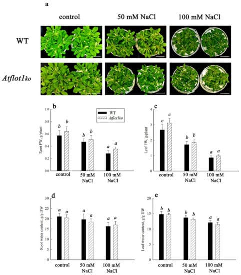 Growth characteristics of A. thaliana WT and Atflot1ko mutant plants and hydration levels of the plant organs. The plants were grown either in the absence (control) or presence of NaCl in the nutrient solution (NS) at final concentrations of 50 or 100 mM; (a) general view of plants, scale bar—5 cm; (b,c) fresh weight (FW) of roots and leaves; (d,e) water content in roots and leaves. Means ± SE are given (n = 3, average weight from 16 plants in each of the repetition). Different letters indicate statistically significant differences between the samples (ANOVA; p < 0.05).