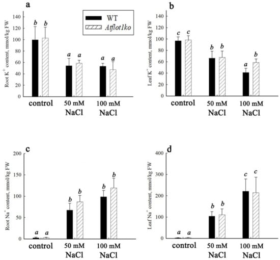 K+ (a,b) and Na+ (c,d) content in roots and leaves of A. thaliana WT and Atflot1ko knockout mutant plants grown either in the absence (control) or presence of NaCl in the medium at final concentrations of 50 and 100 mM. Here, (a,c) roots, and (b,d) leaves. Means ± SE are given (n = 15). Different letters indicate statistically significant differences between the samples (ANOVA; p < 0.05).