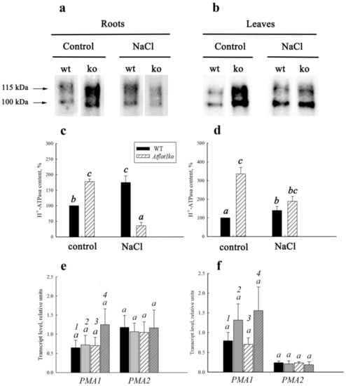 Under control conditions, in PM isolated from both roots and leaves of the Atflot1ko plants, the relative content of H+-ATPase per weight unit in the membrane fraction was noticeably higher than in WT. Salt shock also led to an increase in H+-ATPase content in PMs isolated from the organs of WT plants. However, the increase in H+-ATPase content in PM under the combined action of both the mutation and salt shock was smaller when compared with effect of only the mutation, and even the H+-ATPase content in PM became smaller than in WT in control conditions (Figure 4c,d).