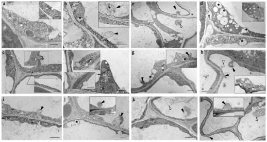 Transmission electron micrographs of root cells of 4-day-old seedlings of A. thaliana WT (a–d) and Atflot1ko knockout mutant (e–l) grown either in the absence (a,b,e–h) or in the presence (c,d,i–l) of NaCl. Black asterisks indicate multivesicular bodies (MVBs), white asterisks indicate Golgi complexes (GCs), black short arrows indicate paramural bodies (PMBs), white short arrows indicate derivatives of paramural bodies (PMBDs), and black long arrow indicate the ER. Scale—1 µm.