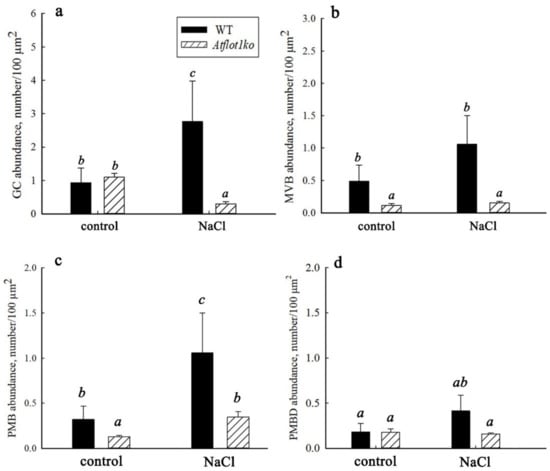 The frequency of occurrence of GCs (a), MVBs (b), PMBs (c), and PMBDs (d) in the root cells of 4-day seedlings of A. thaliana WT and Atflot1ko plants grown either in the absence or in the presence of NaCl. Means ± SE using 100 individual cells are given (n = 100). Different letters indicate statistically significant differences (ANOVA; p < 0.05).