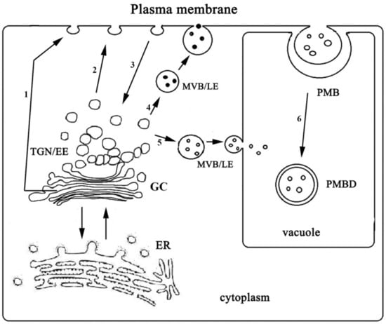 One of the pathways that contributes to the transport of molecules into vacuoles is forming PMBs, with consequent transformation of PMBs into PMBDs. Most likely, these structures are involved in the transfer of not only PM and tonoplast proteins into the vacuolar lumen, but also the cytoplasmic material located between these membranes, as well as substances contained in apoplast (Figure 8).
