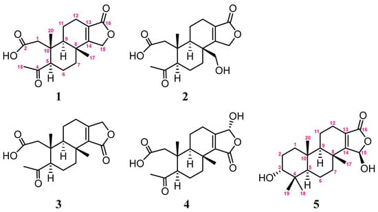 Spongian diterpenoids and structurally related metabolites are a series of natural products with unique structures distributed in sponges of the genus Spongia, and the structural diversity and potential biological significance of these compounds are well known [1,2,3,4,5,6,7,8,9,10,11]. Recently, we have reported the discovery of new spongian diterpenes, including four rare 5,5,6,6,5-pentacyclic diterpenoids, from a Red Sea sponge, Spongia sp. [12,13]. Some of these compounds have been shown to display antibacterial and anti-inflammatory activities. In our continuing study on the chemical constituents from this sponge, we further discovered four new 3,4-seco-3,19-dinorspongian diterpenoid lactones, secodinorspongins A−D (1−4), and one classical spongian diterpenoid lactone, sponginolide (5) (Figure 1). Compounds with the same carbon skeleton of 1−4 have been found only two times so far [1,2], and were discovered in Red Sea sponges for the first time. The relative structures and absolute configurations of these compounds were established by the analyses of MS, UV, IR, NMR, and CD spectra (Supplementary Figures S1–S51 and Figure 1, Figure 2, Figure 3 and Figure 4). Furthermore, the cytotoxicity, antibacterial and anti-inflammatory activities of 1−5 were assayed. Herein, we report the isolation, structural elucidation, and bioactivity evaluation of these compounds.