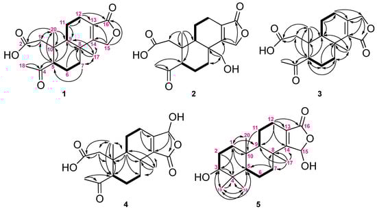 The selected COSY (▬) and HMBC (→) correlations of 1–5.