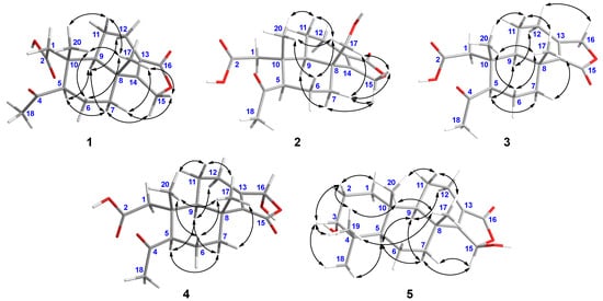 The key NOESY (↔) correlations of 1–5.