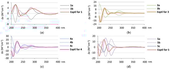 (a) Calculated ECD curves of 5R,8R,9R,10R-1 (1a), 5S,8S,9S,10S-1 (1b) and the experimental CD curve of 1. (b) Calculated ECD curves of 5R,8R,9R,10R-3 (3a), 5S,8S,9S,10S-3 (3b) and the experimental CD curve of 3. (c) Calculated ECD curves of 5R,8R,9R,10R,16R-4 (4a), 5S,8S,9S,10S,16S-4 (4b), 5R,8R,9R,10R,16S-4 (4c) and the experimental CD curve of 4. (d) Calculated ECD curves of 3R,5R,8R,9R,10R,15R-5 (5a), 3S,5S,8S,9S,10S,15S-5 (5b), 3R,5R,8R,9R,10R,15S-5 (5c) and the experimental CD curve of 5.