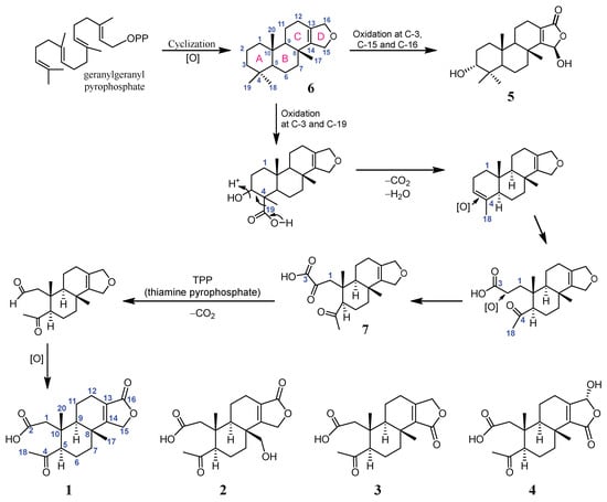 It is suggested that compounds 1–4 share the same biogenetic origin, as they are obtained from the same organism. Consequently, we propose that 1–4 might be biosynthesized from the spongian diterpene (i.e., 6, Scheme 1). The initial oxidation at C-3 and C-19 and the subsequent decarboxylation resulting in the loss of C-19 and dehydration, generate a methyl cyclohexene moiety. Further oxidative cleavage on the double bond of the cyclohexene ring and oxidation at C-2 give intermediate 7 (Scheme 1). With the loss of CO2 from the β-keto acid moiety and the subsequent oxidation at the relevant position, diterpenes 1–4 may be generated, as illustrated in Scheme 1.
