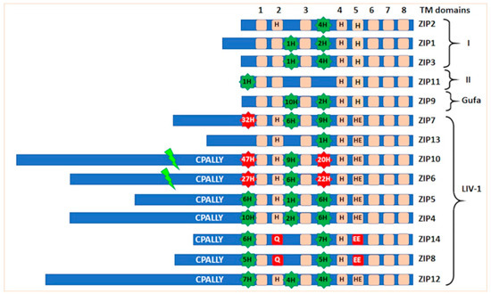 Comparison of features of the 14 human ZIP family members. The 14 human ZIP family members can be divided into four sub-groups with the LIV-1 family containing nine members. The highly conserved HEXPHEGD motif in TM5 of the LIV-1 subfamily is shown by HE. Conserved histidine residues in TM domains are shown by H. The different residues for ZIP8 and ZIP14 in TM2 and TM5 are shown in red boxes. Regions of histidine residues in the N-terminus, extracellular loop TM2–3 and intracellular loop TM3–4 are shown with green backgrounds with 10 residues or less and with red backgrounds when in excess of 10 residues. The predicted PEST site for N-terminal cleavage of ZIP6 and ZIP10 is indicated by a green shard. The CPALLY motif is present in the N-terminus of all LIV-1 family members that can reside on the plasma membrane.