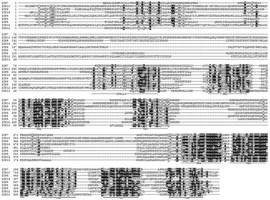 Analysis of the protein sequences of these zinc transporters has allowed much information to be obtained about the LIV-1 family which may be relevant to their function in cells. The nine human members of this LIV-1 subfamily of ZIP transporters are ZIP4-8, ZIP10 and ZIP12-14 [10]. They are all predicted to have eight transmembrane domains [10], which has been confirmed by structural data [11], although many transmembrane prediction packages do not recognize TM4 and TM5 as valid transmembrane domains due to their low hydrophobic quality, many of which still list the total number of transmembrane domains as six or less. Additionally, these TM domains contain histidine and proline residues which were not considered valid for TM domains in the early algorithms used for TM prediction. This means that internet protein pages such as Uniprot list an incorrect number of TM domains, usually only five or six TM domains, which should be treated with caution when interpreting results. These nine sequences have been aligned using the Clustal Omega software [12] (Figure 2) and shaded using Boxshade where the black residues are identical and the grey residues are from similar amino acid families. Generally the transmembrane domains are the most homologous areas of the sequences, consistent with these proteins having a role in transporting zinc. However, there are additional features present in the LIV-1 family that are absent in the rest of the ZIP family of zinc transporters (Figure 3) which are discussed in more detail below.