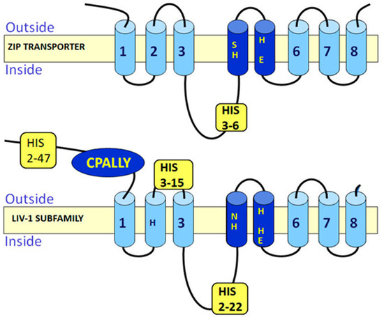 Schematic comparing the predicted structure of the LIV-1 subfamily of ZIP transporters with other ZIP transporters. The LIV-1 family contains the conserved HEXPHE motif in TM5 as well as a conserved His residues in TM2 and TM4. They also have many more His residues amassing 76 residues in ZIP10 alone which are spread between three regions, the N-terminus, the extracellular loop between TM2–3 and the intracellular loop between TM3–4. Additionally, the LIV-1 family members that move to the plasma membrane also have a conserved CPALLY motif on the N-terminus.